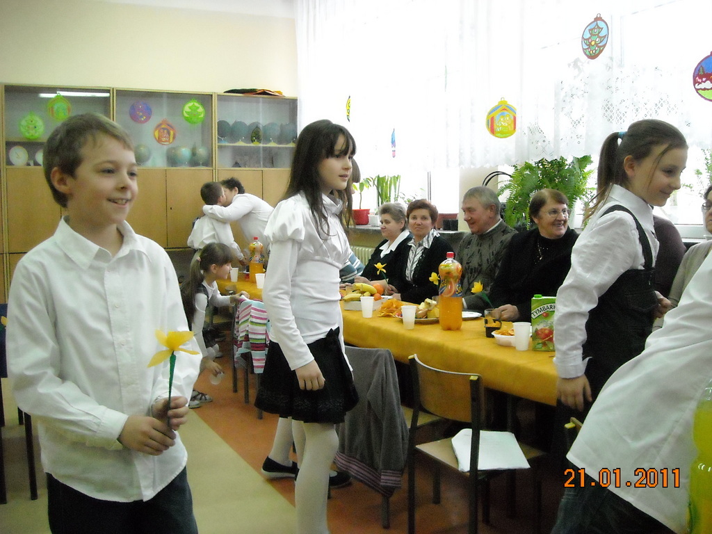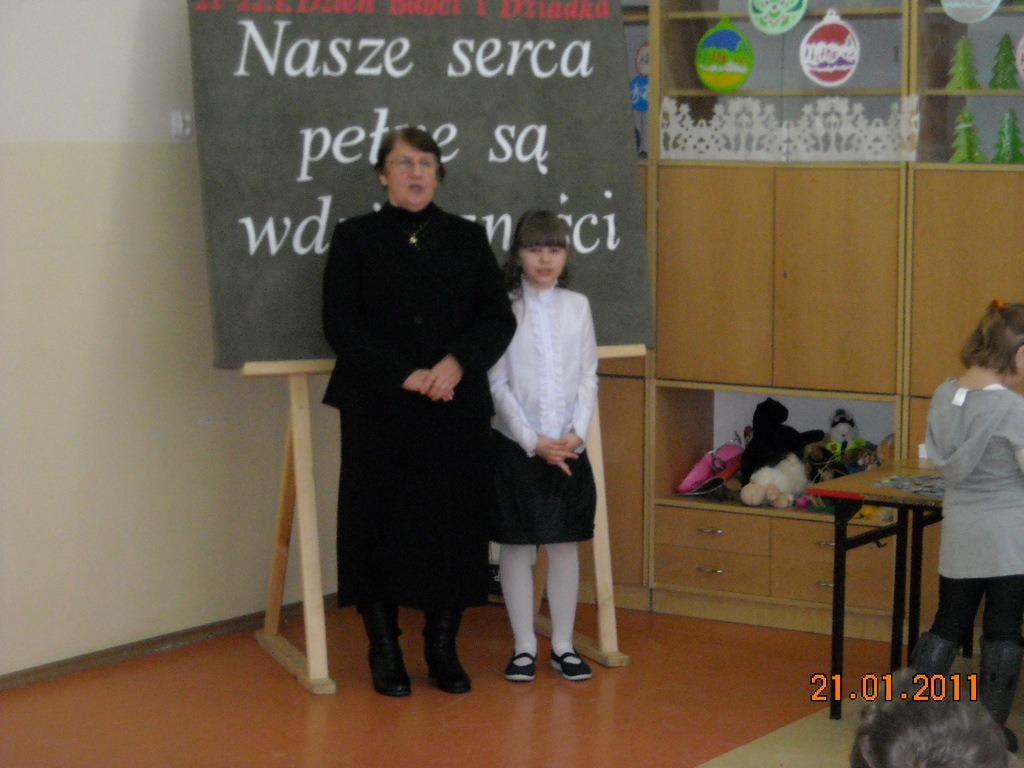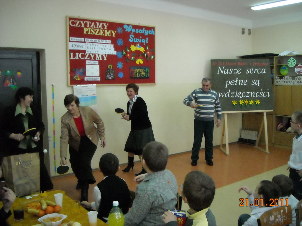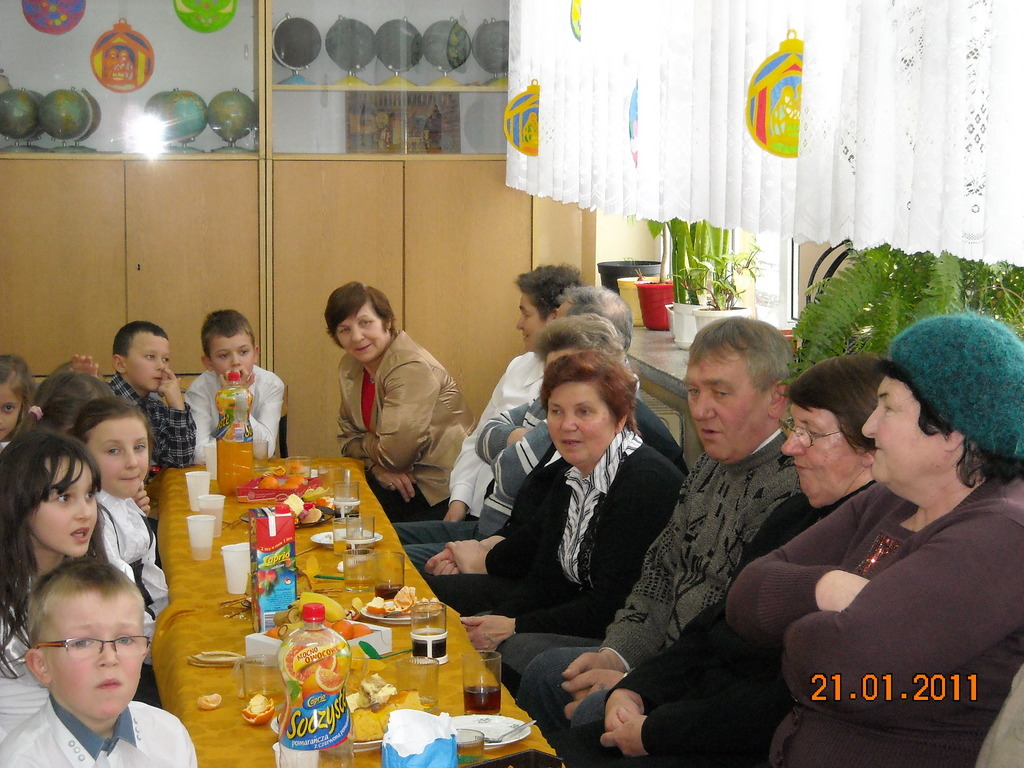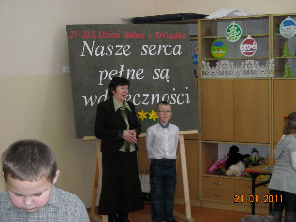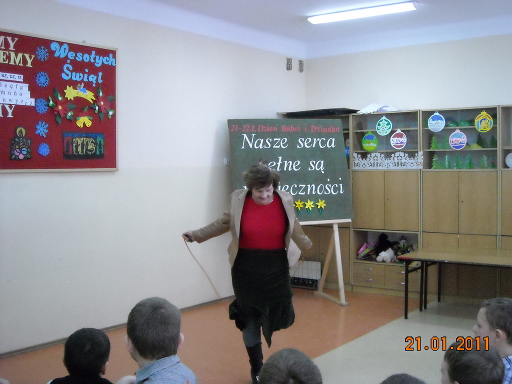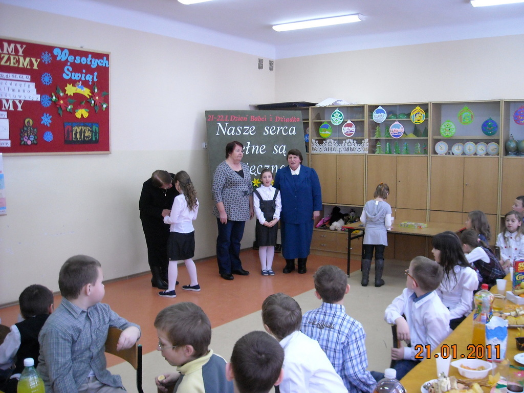 W dniu 21.01.2011r. odbyło się uroczyste spotkanie uczniów klasy II z babciami i dziadkami. Z okazji ich święta uczniowie przygotowali występ słowno-muzyczny. Po występie uczniowie złożyli życzenia i wręczyli kwiaty. Następnie odbyły się różne wspólne zabawy. Seniorzy razem z wnukami bardzo chętnie brali udział w ciekawych i wesołych zabawach. Wspólnie śpiewano kolędy i piosenki okolicznościowe. Na zakończenie wychowawczyni Pani Jolanta Żołyńska podziękowała wszystkim gościom za przybycie do szkoły, za wspólnie spędzony czas, a rodzicom za przygotowanie poczęstunku.