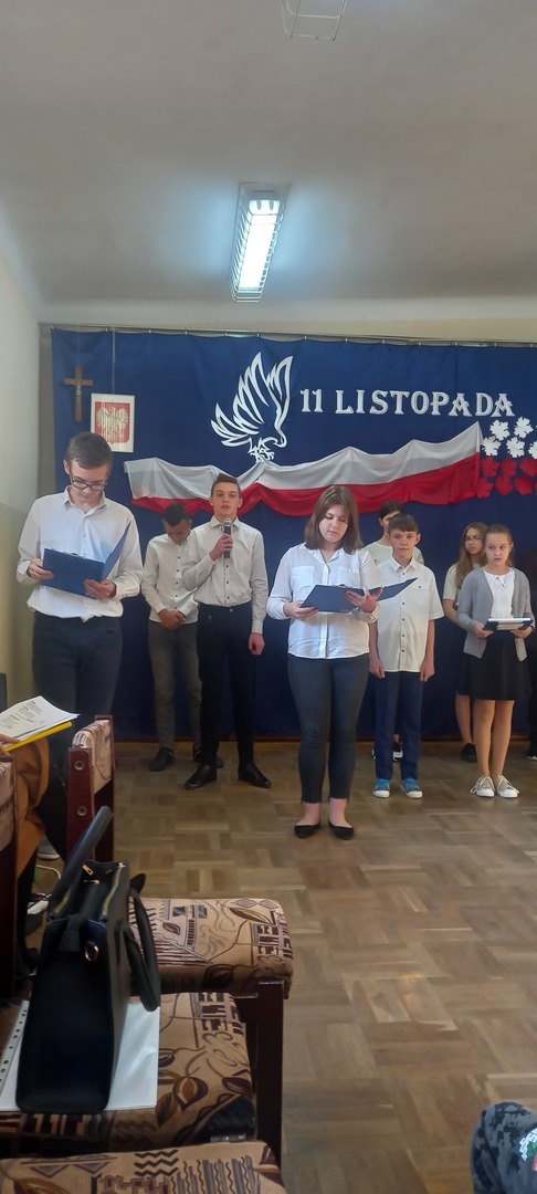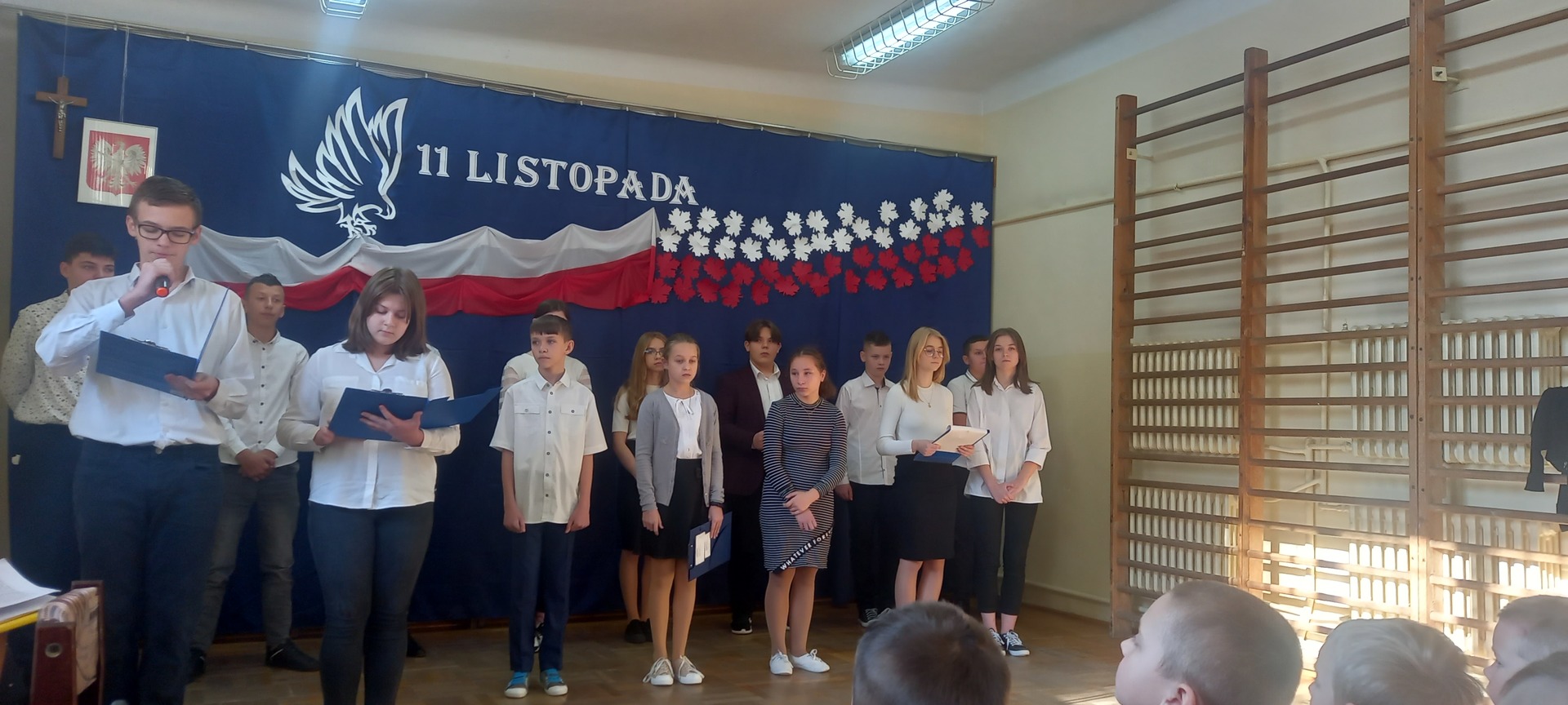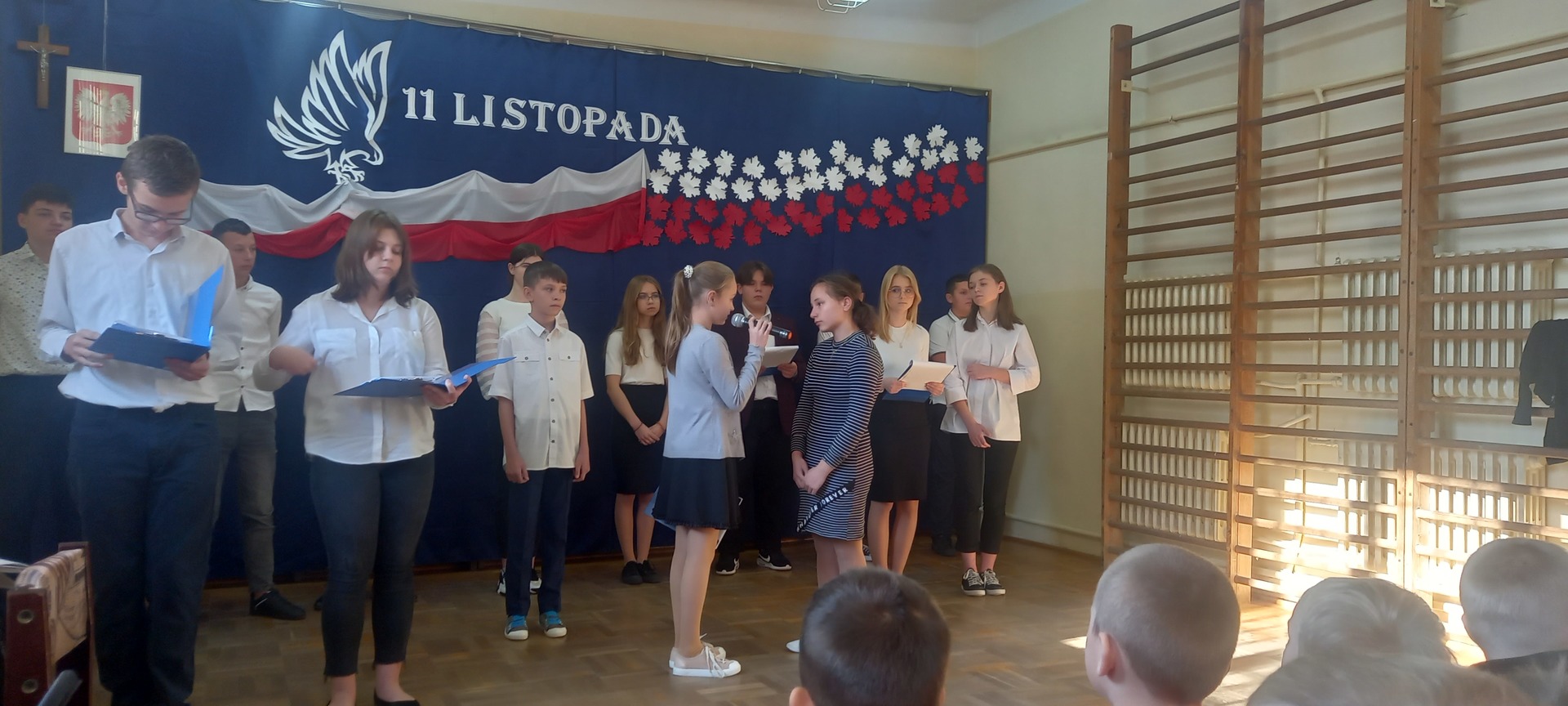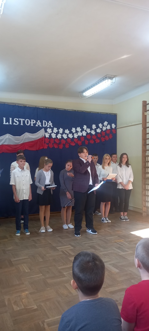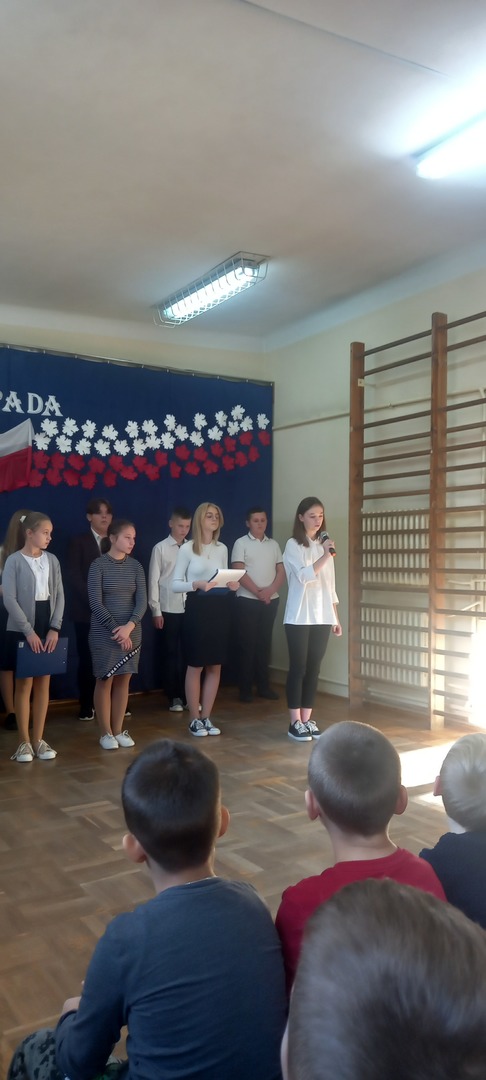 Społeczność naszej szkoły patriotycznym apelem uczciła kolejną rocznicę odzyskania przez Polskę niepodległości. Uczniowie klas V i VIII zaprezentowali montaż słowno-muzyczny przybliżający historyczne okoliczności tych ważnych wydarzeń. Pięknie recytowali wiersze, a zaśpiewane przez nich pieśni patriotyczne były pełne radości. Barwy biało-czerwone dały nam wszystkim poczucie dumy i wspólnoty.