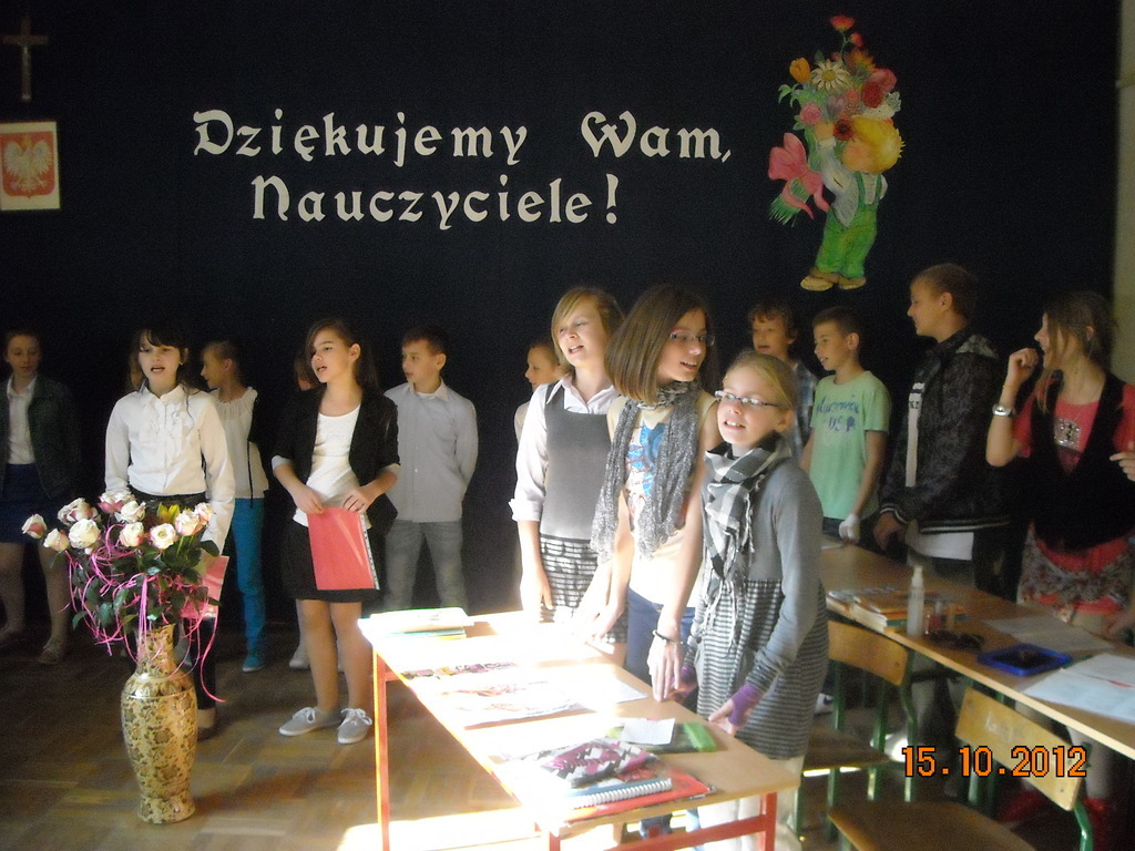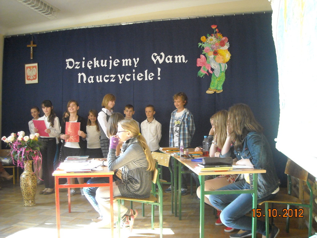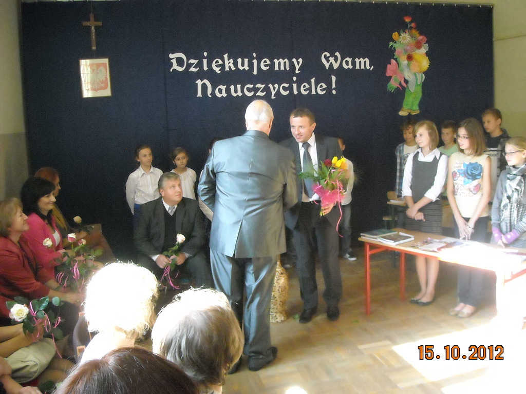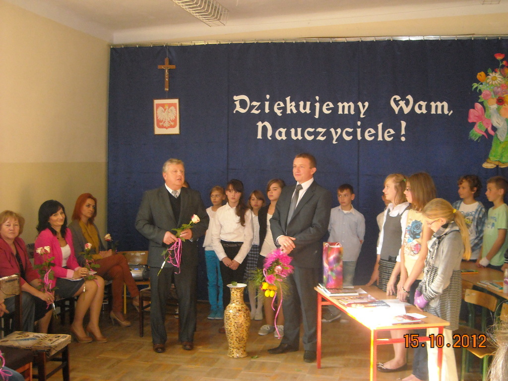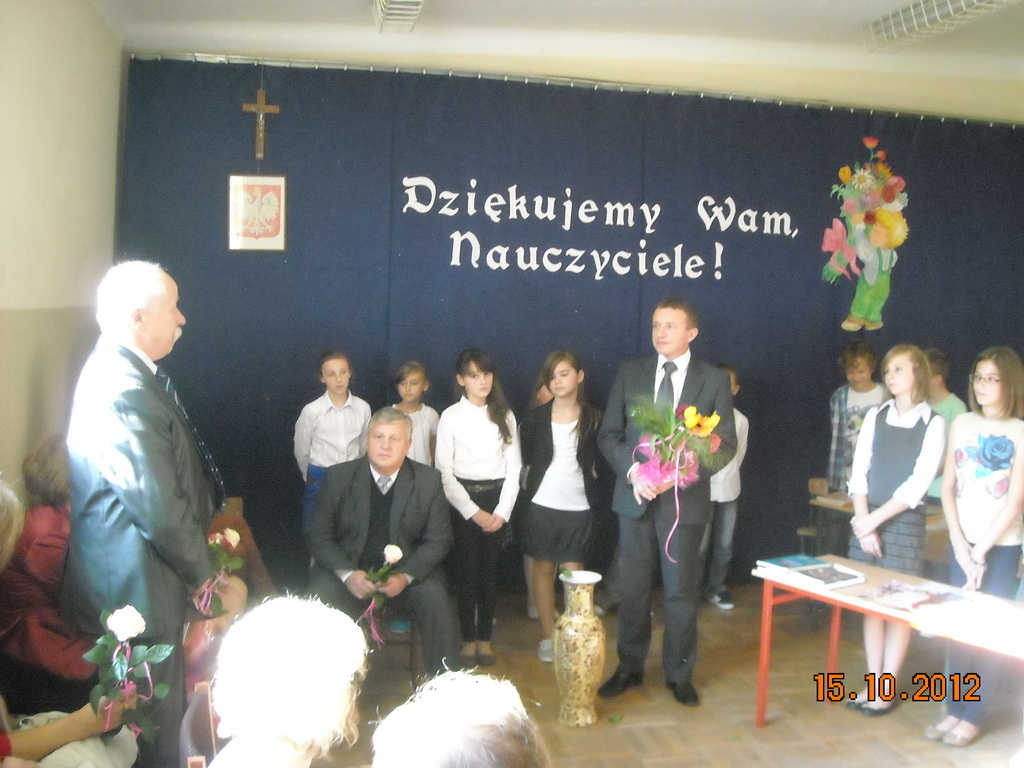 W naszej szkole uroczysta akademia z okazji Dnia Nauczyciela odbyła się 15. 10. W uroczystości wzięli także udział zaproszeni goście: pan wójt Paweł Kołodziejski , pan przewodniczący Rady Gminy Krzysztof Soliwoda, ksiądz Wojciech Goryszewski. Uczniowie dziękowali nauczycielom za uśmiech, przekazywaną wiedzę, za trud włożony w kształtowanie serc i umysłów. Swoją wdzięczność wychowankowie wyrazili poprzez program artystyczny przygotowany pod kierunkiem pani Elżbiety Żołyńskiej. Recytowali wiersze, śpiewali piosenki, a także zaprezentowali swoje zdolności aktorskie w humorystycznych scenkach z życia szkoły. Miłym akcentem uroczystości były życzenia złożone wszystkim nauczycielom i pracownikom szkoły przez pana wójta i pana Krzysztofa Soliwodę.